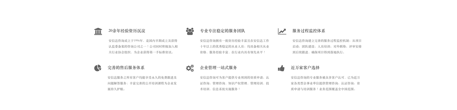 珠海ISO認證咨詢機構-安信達咨詢是一九九六年七月經(jīng)深圳市工商局批準注冊、國家認監(jiān)委首批備案認證咨詢機構、廣東省首批咨詢培訓備案企業(yè)機構,中小企業(yè)服務中心服務示范單位。公司技術力量雄厚,擁有具有國內(nèi)、國外注冊資格的簽約專兼職咨詢師200余人。目前,已成功地為10000多家企業(yè)提供了認證咨詢、驗廠咨詢、管理咨詢、資質(zhì)申請和培訓服務。公司與國內(nèi)外眾多知名、權威機構(如賽寶、CQC、ISCCC、BSI、SGS、DNV、TUV、BVQI、ITS、DQS、NQA等)等建立了深度及密切的合作關系。熟悉其認證程序與安排,這將有助于保證我們的客戶通過認證。公司的服務宗旨是“誠信、嚴謹、高效、求實”,憑著豐富的專業(yè)管理理論/技術/方法,確??蛻舻墓芾眢w系符合ISO9001、IATF16949、ISO27001、ISO20000、ISO22301、ISO45001、TL9000、ISO14001、SA8000、OHSAS18001、ISO22000、QC080000、ISO13485、ISO28000等標準要求并能有效運作,按計劃順利通過客戶自選的任何國內(nèi)外認證機構之認證審核,并順利取得證書。